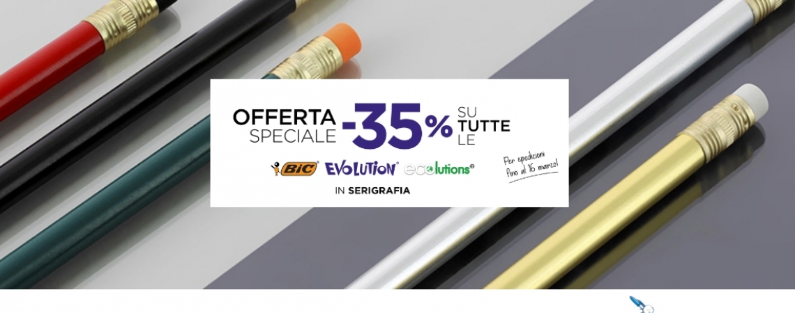 Fino al 16 marzo su Bi.Pen fare una scelta ecologica premia. Tutte le matite Bic Evolution Ecolutions con stampa in serigrafia sono, infatti, al 35% di sconto. Si tratta di matite in grafite di resina sintetiche, senza legno, realizzate con materiale riciclato che non si scheggia in caso di rottura. All’interno una mina resistente in grafite HB. Si può scegliere la versione con o senza gomma e sono completamente personalizzabili nel colore del corpo, della ferula e della gomma con d...