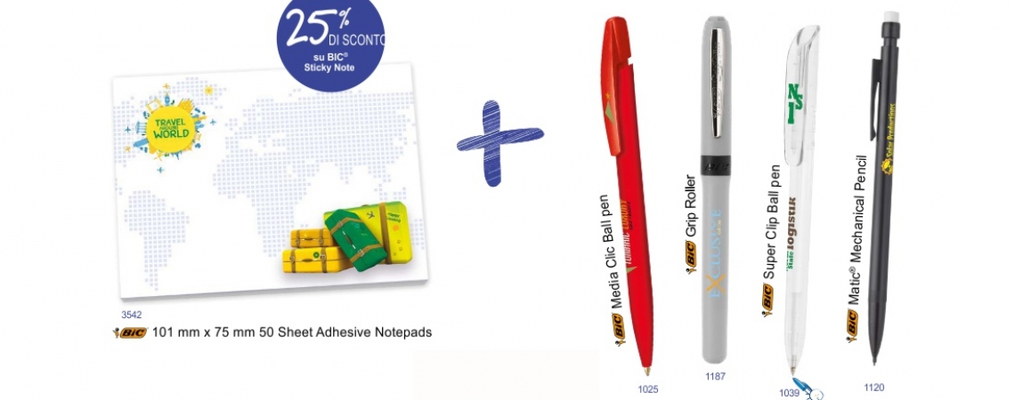 Per prendere appunti servono carta e penna, una combinazione originale e soprattutto conveniente su Bi.Pen! Sì perché fino al 31 dicembre se acquisti una tra Media Clic penna a sfera, Grip Roller, Super Clip penna a sfera e Matic portamine puoi approfittare del 25% di sconto per acquistare Bic Sticky Note 101 mm x 75 mm Sheet Adhesive Notepads da 50 foglietti adesivi personalizzato. Lo sconto vale per ordini di quantitativi minimi o superiori di penne a sfera/matite. &Egrav...