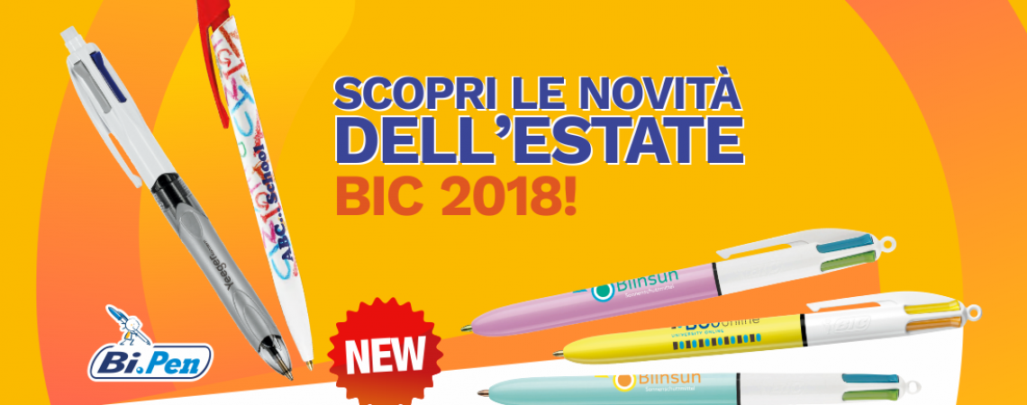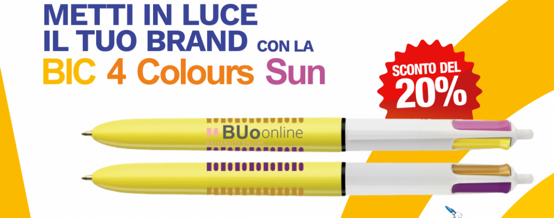 L’estate è esplosa e con lei tutto il nostro desiderio di dare risalto al tuo brand con nuovi eccezionali strumenti di scrittura. Bic cattura l’energia del sole e la diffonde attraverso il suo originale modello 4 Colours Sun, un gadget esclusivo davvero in grado di mettere in luce la tua immagine aziendale. Personalizzabile e acquistabile direttamente sul nostro portale BiPen con uno sconto del 20%, la nuova penna BicGraphic racchiude quattro colori fashion in un fusto deci...