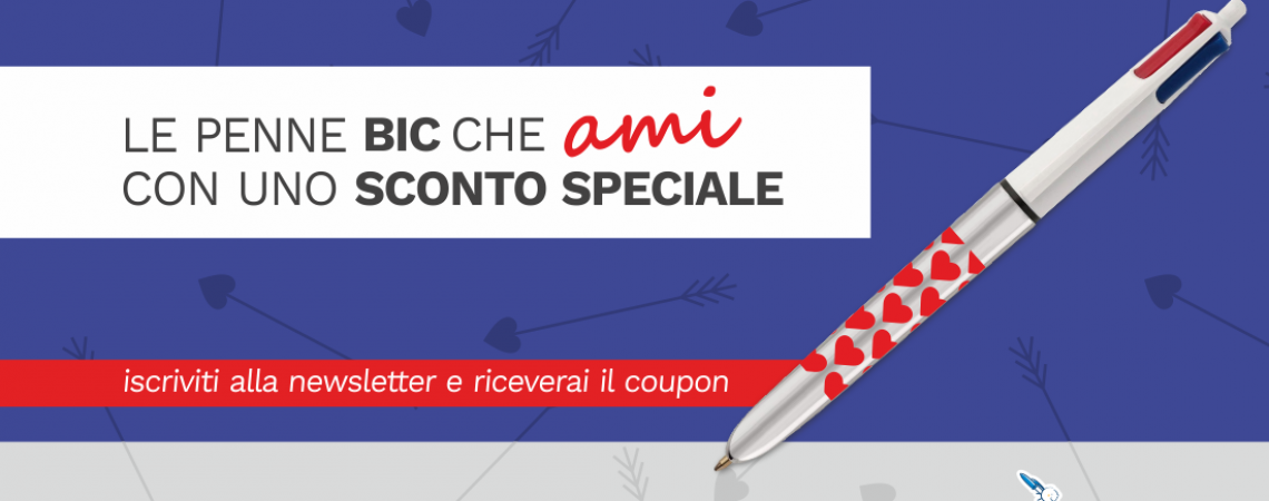 Mancano poche ore per approfittare della promozione di San Valentino pensata da Bi.Pen. Solo se ti iscrivi alla newsletter puoi ottenere uno sconto speciale del 15% su tutti i prodotti personalizzati Bic e scrivere così le tue parole d’amore in maniera conveniente. La promozione è valida fino al 18 febbraio su tutti gli acquisti. Per usufruirne basta lasciare la mail sul nostro sito nella sezione “Iscriviti alla newsletter” in fondo alla home page. Trasformar...