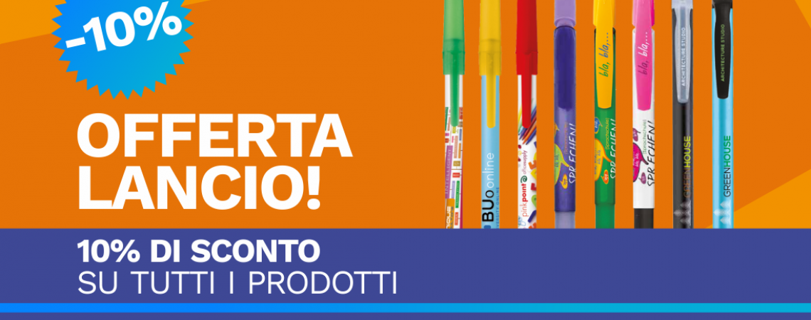 Approfitta dell’offerta lancio sul nuovo sito Bi.Pen. Per tutti i prodotti abbiamo pensato ad un’incredibile promozione del 10% di sconto. Ogni nuovo inizio va festeggiato e per questo tutti i prodotti sono scontati! Entra sul sito, scegli l’articolo che preferisci e personalizzalo con i colori che meglio rappresentano il tuo logo aziendale. Prova il nuovo configuratore che ti darà in anteprima un’idea di quello che sarà il risultato finale. Che...