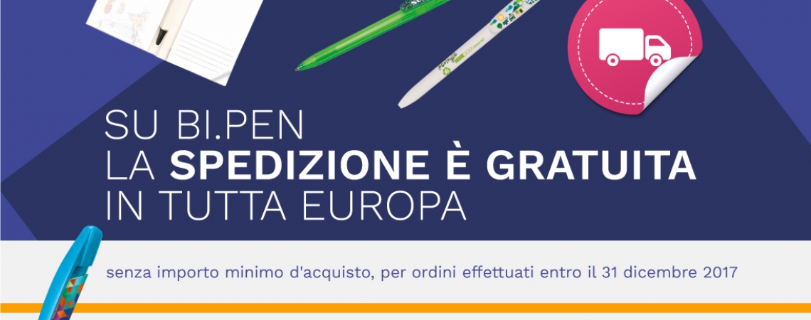 Spedizione inclusa nel prezzo? Solo su Bi.Pen! Se acquistate penne personalizzate e altri strumenti di scrittura sul nostro sito la spedizione sarà gratuita su tutto il territorio europeo. Gli iconici prodotti Bic vi raggiungeranno ovunque siate in Europa, tempo 15-20 giorni dall’approvazione delle bozze della personalizzazione. Non c’è un importo minimo d’acquisto, non ci sono sorprese. La spedizione è gratuita su tutto fino al 31 dicembre 201...