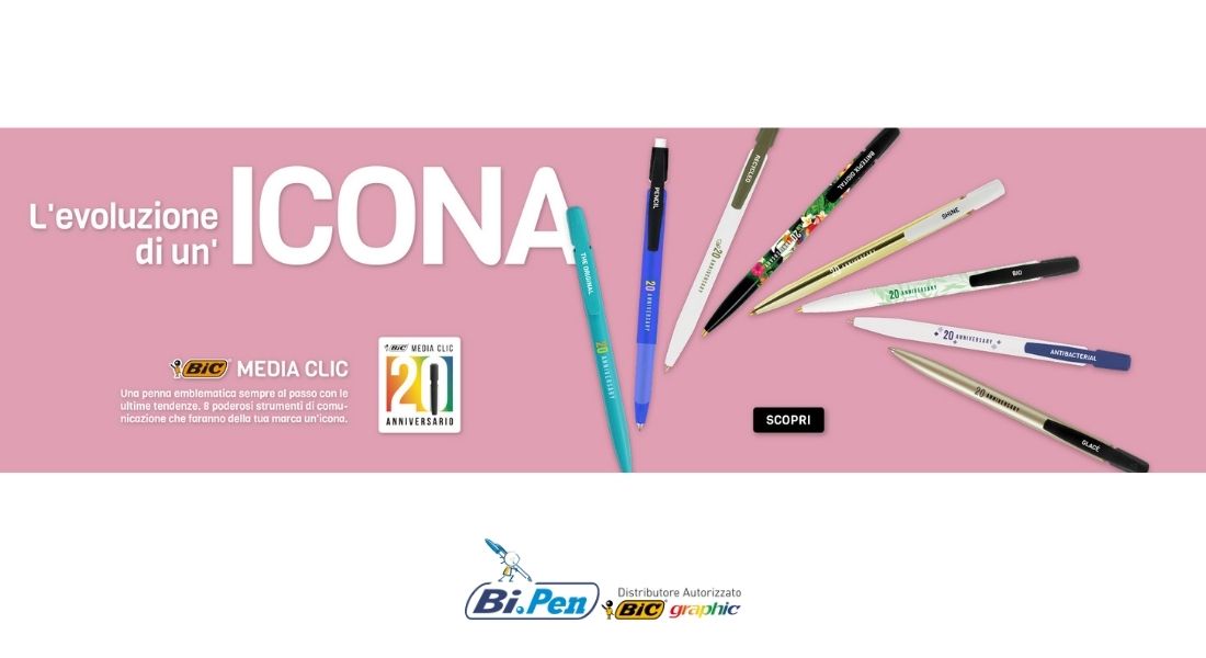 Bic Media Clic compie 20 anni! Una penna emblematica sempre al passo con le ultime tendenze che si presenta in 8 versioni tutte da personalizzare. L’Originale intramontabile, il portamine, la versione Recycled realizzata solo con materiale riciclato, BritePix Digital per la tua comunicazione a 360°, Shine per chi sceglie di brillare, Bio per chi ha un occhio per l’ambiente, Antibacterical per evitare la proliferazione di batteri, Glace elegante e raffinata. Personalizzatela su Bi.Pen!