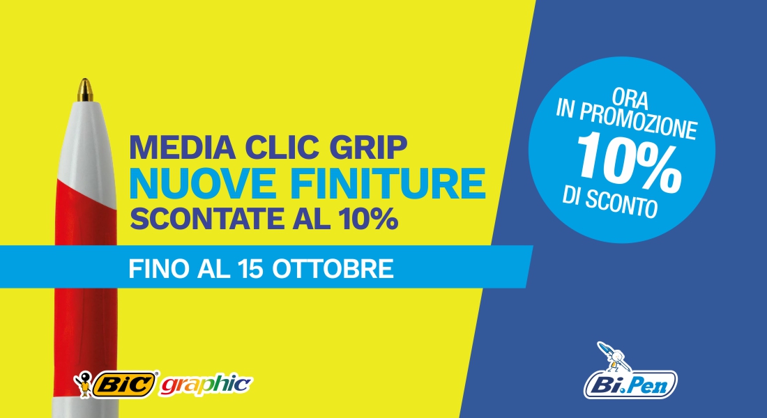 Una penna iconica morbida al tatto, ideale per promuovere il tuo brand, anche e soprattutto grazie alle nuovissime rifiniture. Stiamo parlando della Bic Media Clic Grip: fino al 15 ottobre puoi approfittare di un’offerta incredibile per assicurarti la numero uno con impugnatura morbida scontata del 10%. Ed in più puoi scegliere di personalizzare la penna con le nuove finiture brillante e trasparente che si vanno ad aggiungere a quelle pre-esistenti opaca e traslucida. Provate il configuratore sul nostro sito e scegliete la Media Clic che più vi rappresenta! Lo sconto del 10% è, infatti, valido su tutta la famiglia fino al 15 ottobre. Approfittatene!