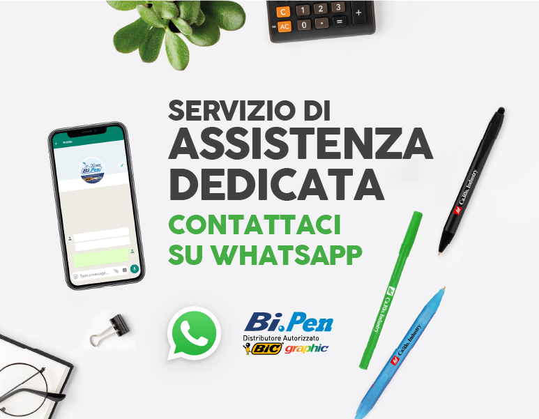Comunicare direttamente con un assistente commerciale per avere un prodotto quanto più soddisfacente possibile aiuta! Per questo Bi.Pen utilizza un numero WhatsApp diretto, un filo diretto per facilitare il servizio e garantire in tempi rapidi la realizzazione di penne personalizzate. Il numero WhatsApp permette di chiedere maggiori informazioni e delucidazioni direttamente ai nostri assistenti commerciali, che sapranno rispondervi e fornirvi ogni dettaglio di un prodotto che è di alta qualità, possiede infinite possibilità di personalizzazione e viene creato in maniera quanto più confacente possibile all’immagine aziendale. L’assistenza diretta permette di creare un primo approccio inviando subito una bozza grafica gratuita realizzata con il logo aziendale, di modo che sia quanto più uniforme possibile alle esigenze promozionali del cliente. Una volta visionata la bozza sarà il cliente, poi, a decidere quale preferisce o cosa intende modificare, per ricevere successivamente il preventivo e decidere se proseguire con l’ordine. I dati personali vengono trattati rispettando le principali norme sulla privacy.