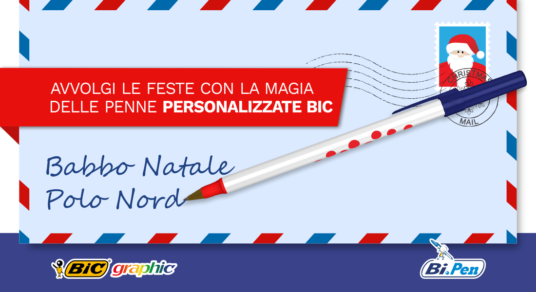 Questo Natale lascia il segno! Con Bi.Pen puoi fare un regalo di grande impatto, sfruttando la stampa di alta qualità Bic. Scegli tra le penne personalizzate Bic caratterizzate da colori brillanti in varie aree di stampa, una personalizzazione estrema, vivace e divertente che coinvolge, emoziona e sorprende. La brillantezza e la corposità dei colori risaltano all’occhio, la grafica personalizzata conferisce carattere e originalità alle penne Bic, le più riconosciute al mondo. Scopri sul nostro sito le offerte disponibili e approfitta per fare un regalo personalizzato entro Natale. Affrettati, mancano pochi giorni!