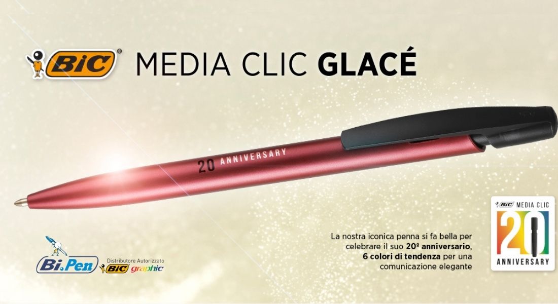 Personalizza Bic Media Clic Glacé: l’iconica penna Bic si fa bella per celebrare il suo 20° anniversario! Scegli tra 6 colori di tendenza per una comunicazione elegante che fa risplendere il tuo marchio. Si tratta di sei nuovi colori laccati in una versione raffinata. Li puoi trovare e personalizzare su Bi.Pen qui. Chiedici maggiori info o utilizza il configuratore automatico sul nostro sito!