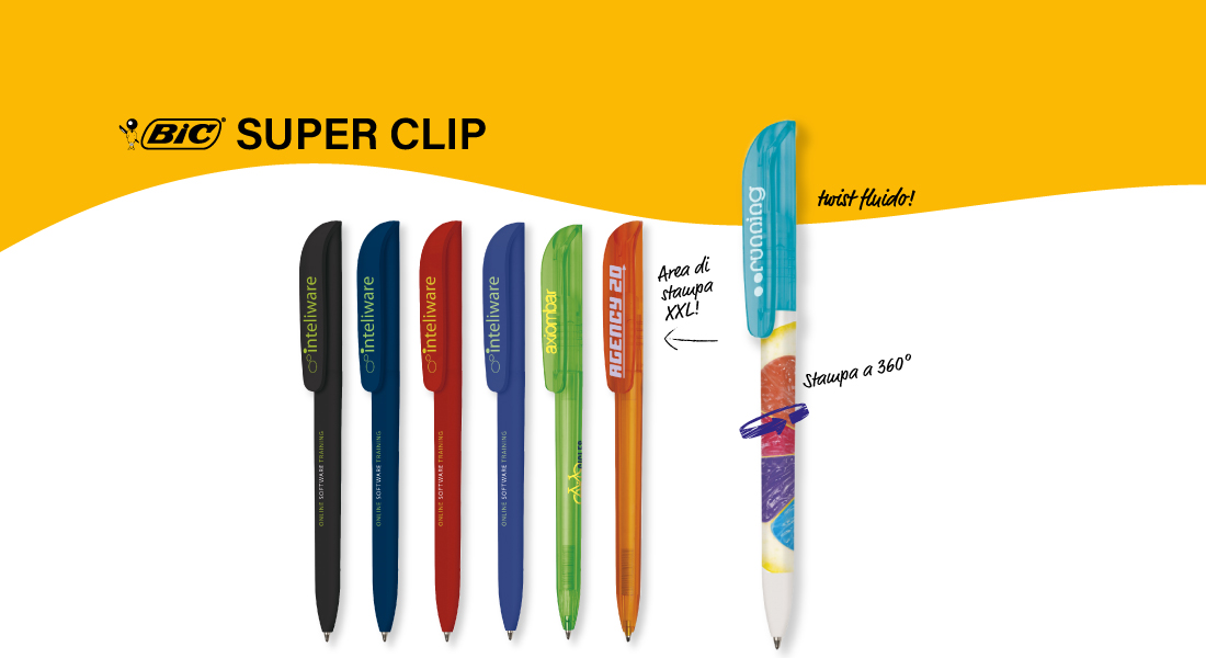 Personalizza la tua Bic Super Clip. Utilizza il configuratore automatico sul nostro sito web, con pochi clic, potrai selezionare i dettagli che desideri, dalla scelta dei colori alla stampa del tuo logo.