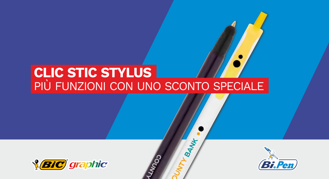 Sono acquistabili con uno sconto speciale del 10% le penne Bic personalizzate nel modello Clic Stic Stylus. Moderne e versatili, le penne di questa originale linea marchiata Bic sono caratterizzate da una duplice funzione. Oltre ad essere degli utilissimi strumenti di scrittura dispongono, infatti, di un efficace stylus per touch, comodo per navigare, scrivere e disegnare su smartphone e tablet.