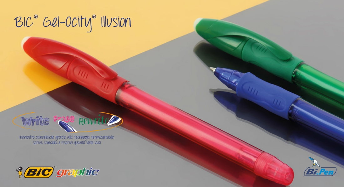 Scrivere, cancellare e riscrivere quante volte si vuole è possibile con Bic Gel-Ocity Illusion. La nuova penna gel Bic Gel-ocity Illusion è uno strumento con inchiostro gel cancellabile che grazie alla tecnologia termosensibile ti permette di scrivere, cancellare e riscrivere all’infinito. Unica ed originale la puoi personalizzare con il tuo logo, si può avere con quattro colori d’inchiostro diversi (rosso, blu, nero e verde) ed è dotata di gomma sulla sommità. Vuoi acquistarla? Scrivi a ordini@bipen.it!