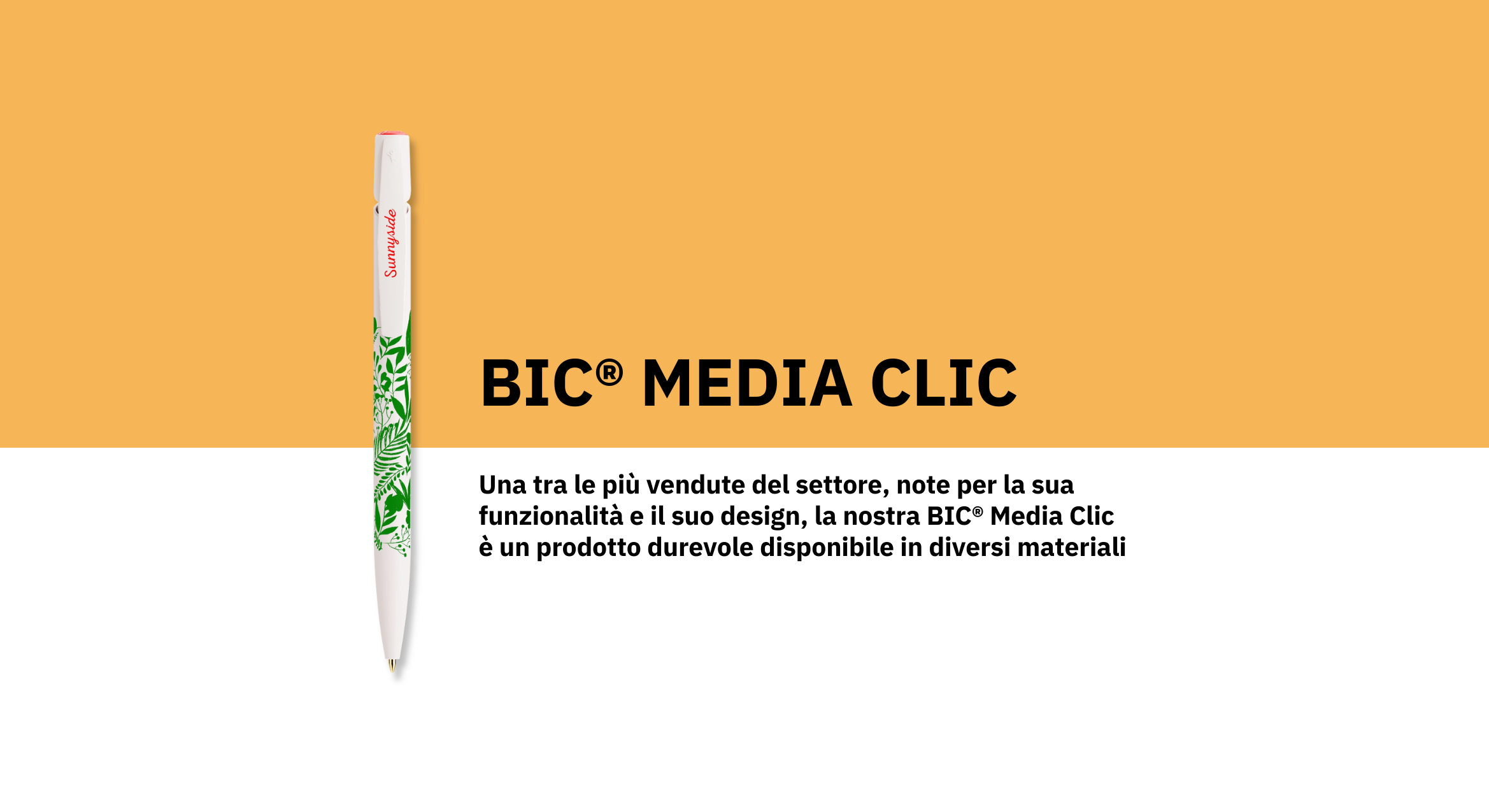 La Media Clic è pensata per durare nel tempo e offre un'ampia varietà di finiture e colori tra cui scegliere. Che tu voglia un look tradizionale ed elegante o qualcosa di più audace e colorato, c'è sicuramente una combinazione di tonalità e sfumature adatte al tuo brand. Potrai personalizzarla con il tuo logo aziendale nelle versioni Standard, Riciclata e Bio-Based.