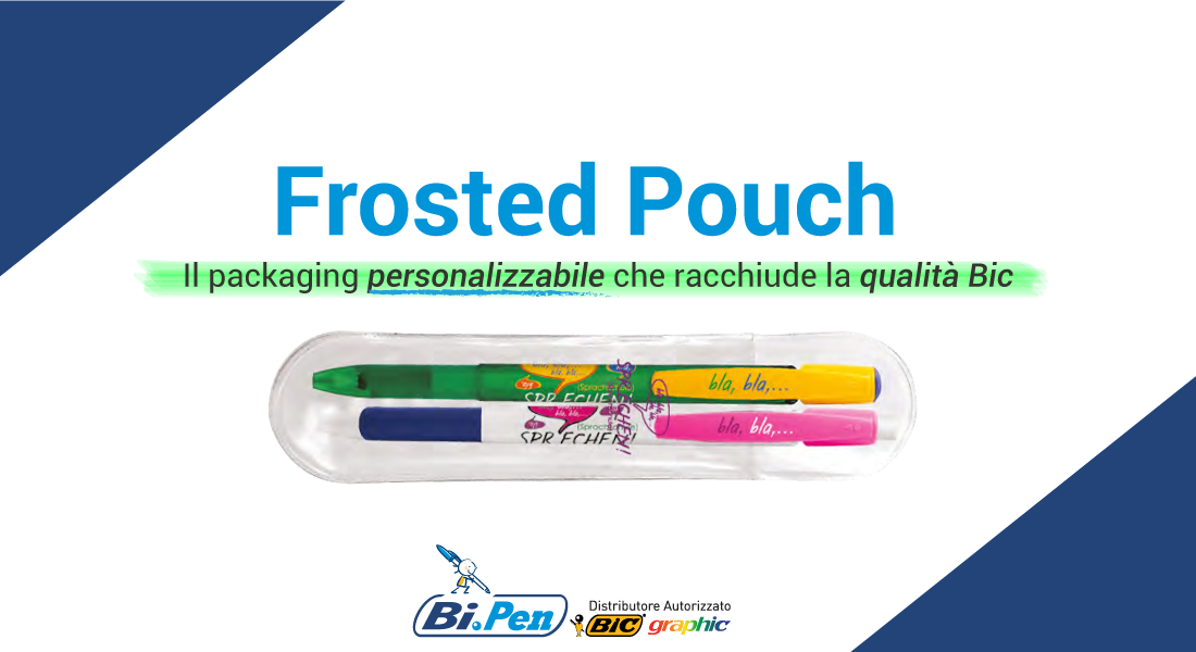 Il packaging Frosted Pouch può contenere uno o due strumenti di scrittura sottili Bic eccetto matite, Bic Matic Grip ed è concepito come un gadget aziendale utile anche al di fuori dell’ambiente professionale.