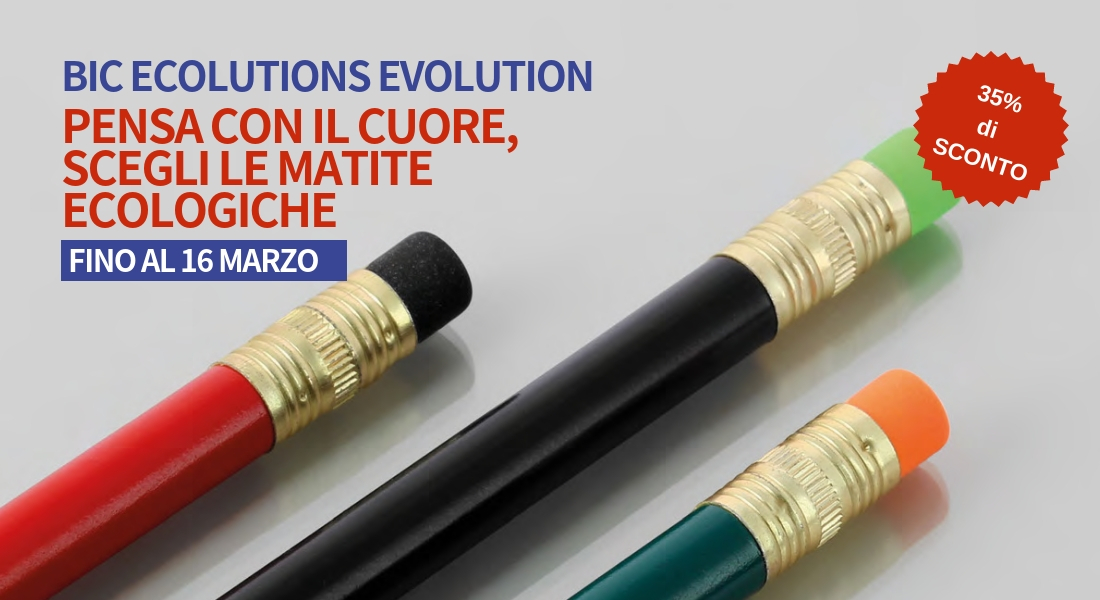 Solo per altri diciassette giorni, infatti, su tutte le matite Bic Evolution Ecolutions con stampa in serigrafia su Bi.Pen hai il 35% di sconto. Si tratta di matite in grafite di resina sintetiche, senza legno, realizzate con materiale riciclato che non si scheggia in caso di rottura. All’interno una mina resistente in grafite HB. Si può scegliere la versione con o senza gomma e sono completamente personalizzabili nel colore del corpo, della ferula e della gomma con diverse combinazioni disponibili. Puoi anche inserire il tuo logo sul corpo per renderla originale e promozionale! Approfitta subito dell’offerta QUI! Visita il sito Bi.Pen ed inizia a personalizzare con il nostro configuratore automatico!