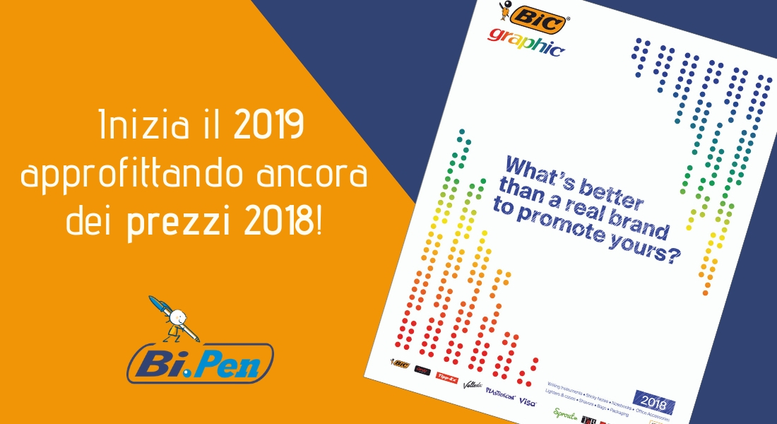 È iniziato un nuovo anno e Bi.Pen è pronta ad accompagnarti con tutta la sua passione nella scrittura delle tue storie! Come? Offrendoti un ricco assortimento di prodotti Bic personalizzabili, un servizio efficiente di assistenza e prezzi vantaggiosi che ancora per poco rimangono gli stessi del 2018. Dal mese di febbraio, infatti, i prezzi potrebbero subire variazioni mantenendosi però sempre altamente competitivi e adeguati alla qualità Bic rinomata in tutto il mondo.