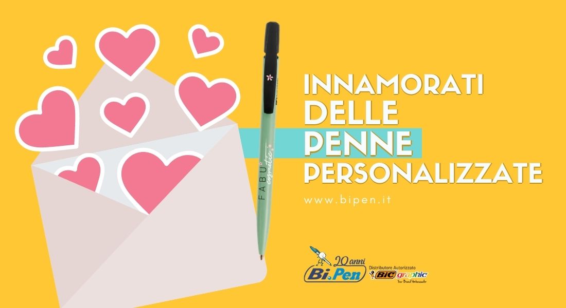 Innamorati delle penne personalizzate Bic. Su Bi.Pen trovi soluzioni efficaci per migliorare la comunicazione di qualsiasi impresa. Le penne Bic sono note in tutto il mondo e personalizzarle è un potente strumento di marketing. Puoi uniformare lo stile della tua penna ai tuoi colori aziendali e regalarla ai tuoi clienti, facendo battere loro il cuore. Il nostro staff è sempre a tua disposizione per fornirti supporto per la personalizzazione. Contattaci nella settimana di San Valentino e faremo breccia nel tuo cuore con le nostre romantiche proposte.