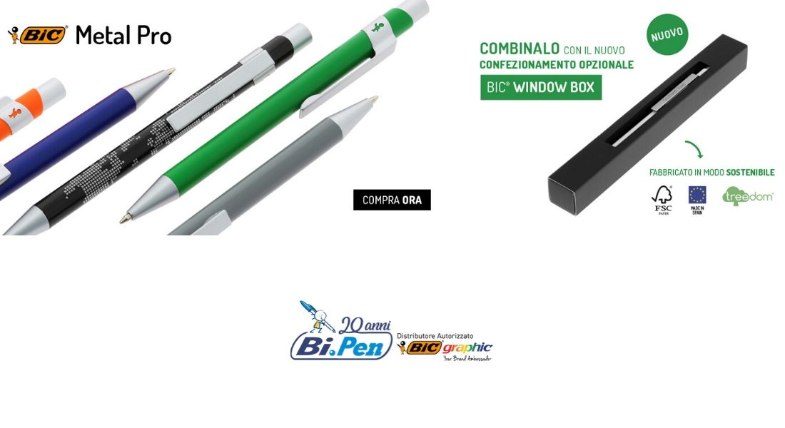 Dettagli metallici, design moderno con un’ottima selezione di colori e finiture. Metal Pro è la penna metallica Bic che puoi personalizzare con il tuo logo aziendale. Massimo comfort di scrittura e inchiostro tedesco ricaricabile la Metal Pro ha tre finiture diverse: lucido, opaco e morbido al tatto. Si può personalizzare con una vasta gamma di colori. Questa elegante penna si può combinare con il nuovo confezionamento opzionale Bic Window Box fabbricato in modo sostenibile e il cui imballaggio può essere riutilizzato come supporto per bigliettini da visita. Un’iniziativa ecologica che darà ancora più lustro alla tua azienda il cui marchio viene amplificato dalla personalizzazione che Bi.Pen realizza per te.