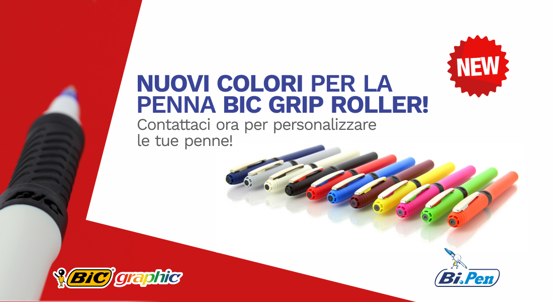 Si avvicina l’estate e la penna Bic Grip Roller si prepara ad indossare le sue vesti più brillanti! Nuovi colori saranno disponibili a partire dalla metà di giugno per personalizzare i vostri strumenti di scrittura firmati Bic Graphic, perfetti da regalare come gadget aziendali utili e pratici.