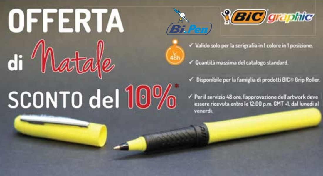 Approfitta delle offerte di Natale! Fino al 31 dicembre puoi avere la famiglia di prodotti Bic Grip Roller al 10% di sconto. L’offerta è valida per la personalizzazione solo per la serigrafia in un colore e in una posizione. Goditi un’esperienza di scrittura morbidissima con Grip Roller: scorre facilmente sulla carta senza macchiare grazie all’inchiostro ad asciugatura immediata, ideale per mancini e destrorsi. Ricorda che se la personalizzazione viene approvata entro le ore 12 dal lunedì al venerdì puoi avere gratis la tua penna personalizzata in 48 ore.