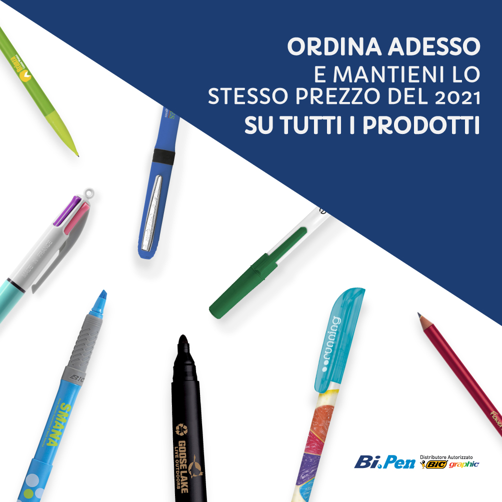 È il momento giusto per ordinare penne personalizzate e altri gadgets dal nostro sito. Inizia col piede giusto l’anno nuovo, potrai raggiungere i tuoi obiettivi di marketing massimizzando la portata del tuo messaggio pubblicitario. Con i gadgets personalizzati Bic, marchio noto in tutto il mondo, potrai avere sempre grande riconoscibilità e affidabilità garantiti. Ricorda: la spedizione e la bozza grafica sono sempre gratuite.