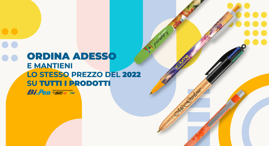 Lo sapevi che il 23 gennaio è la Giornata Mondiale della scrittura a mano? Per celebrarla non puoi non acquistare le penne Bic personalizzate per promuovere la tua azienda! Abbiamo deciso di farti un regalo: se ordini entro il 31 gennaio 2023 mantieni lo stesso prezzo del 2022. Un modo super conveniente per promuovere la tua azienda e iniziare l’anno nel modo giusto.