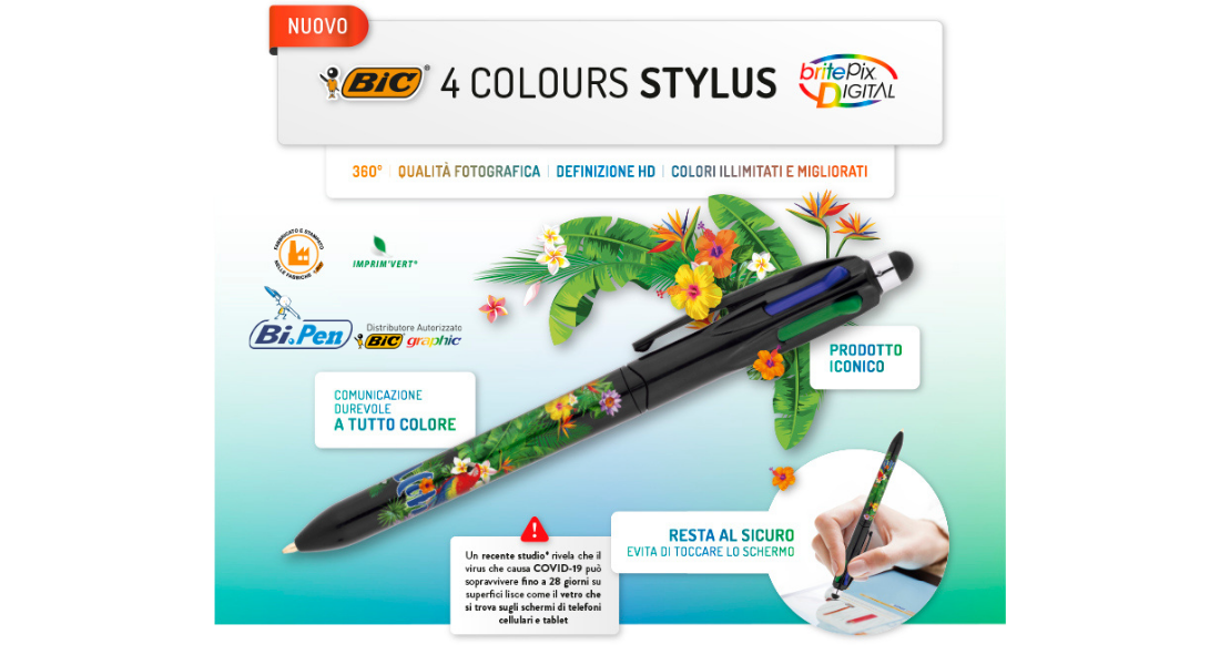 Un prodotto iconico che permette di scrivere e di usare in modo sicuro schermi di smartphone e tablet. È 4Colours Stylus la penna Bic che viene personalizzata con tecnologia BritePixDigital per una comunicazione durevole a tutto colore.