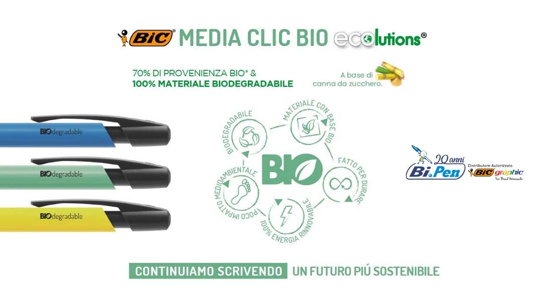 Fai una scelta bio. Scegli Bic Media Clic Bio Ecolutions, una penna col 70% di provenienza bio e prodotta al 100% con materiale biodegradabile derivante dalla canna da zucchero. Una penna bella e colorata, fatta per durare, che si può personalizzare con i tuoi colori aziendali, uno strumento di scrittura che ti aiuta a rilanciare anche l’immagine etica della tua azienda, rendendola sostenibile. Contattaci per la personalizzazione o utilizza il configuratore online!