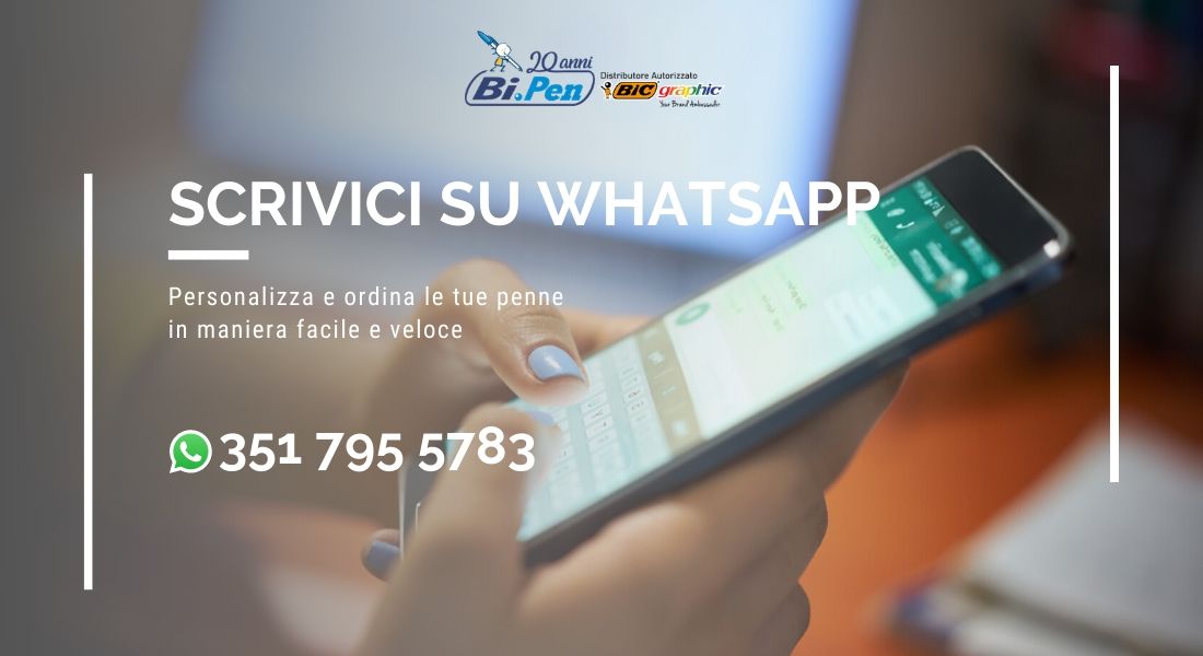 Per effettuare un ordine personalizzato in maniera facile e veloce Bi.Pen ha attivato l’assistenza tramite WhatsApp. In questa maniera personalizzare le penne Bic non sarà mai stato più facile e veloce. L’assistenza tramite WhatsApp permette alle aziende interessate di inviare il logo, di scegliere la penna ideale per la propria attività e di parlare in tempo reale con l’assistenza dedicata. In questa maniera ci vorrà pochissimo tempo per ottenere la bozza e confermare l’ordine in tempo reale.