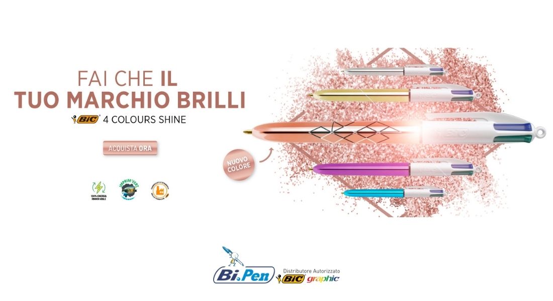 Nuovo lucente colore per Bic 4 Colours Shine. Rose Gold è la nuova colorazione della Bic 4 Colours Shine, la penna iconica in brillanti colori metallici. Sul corpo della penna puoi stampare il tuo logo in serigrafia o a incisione laser. Quattro colori di refil nella stessa biro: blu, nero, rosso e verde. L’aspetto metallico brillante, il meccanismo retrattile sicuro, 8 km di scrittura garantiti. Glamour e alla moda è un accessorio sorprendente, un regalo che lascia a bocca aperta. Personalizzala su Bi.Pen!