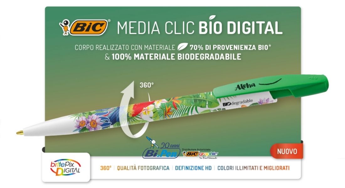 Ecosostenibilità e qualità vanno di pari passo con Bic. È arrivata Bic Media Clic Bio Digital la penna ecologica da oggi anche in stampa digitale. Il corpo è realizzato con materiale 70% di provenienza bio e 100% biodegradabile. La qualità fotografica è a 360°, definizione hd, colori illimitati e migliorati. La personalizzazione può essere effettuata su tutto il corpo a 360°. Il fusto è realizzato con materiale bio a base di canna da zucchero, così da avere un minimo impatto ambientale. Se scegli di personalizzare questa penna legherai il tuo marchio a un concetto positivo e all’avanguardia. Contattaci per maggiori informazioni.