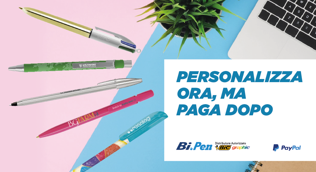 Non mettere in pausa la tua promozione aziendale: inizia subito ma paga con calma. Ti diamo l’opportunità di pagare il tuo ordine in comode rate, attraverso PayPal. Un sistema sicuro e affidabile che ti permetterà di avere subito le penne personalizzate Bic che preferisci, un mezzo promozionale davvero utile che massimizza il tuo messaggio aziendale.