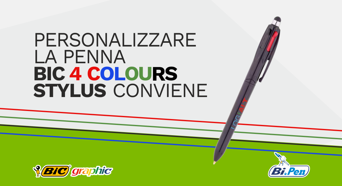 La 4 Colours Stylus è la penna più versatile di Bic perché oltre che scrivere ad inchiostro, in quattro colorazioni, blu, nero, rosso e verde, ha la punta per dispositivi touchscreen che permette di scrivere su tablet e smartphone. Personalizzata è ancora più originale ed inoltre conviene perché sottoposta al 10% di sconto, il regalo perfetto per professionisti e grandi utilizzatori di dispositivi tecnologici di ultima generazione. Sul sito Bi.Pen è possibile personalizzarla completamente e ottenere uno strumento promozionale di alta qualità ad un prezzo conveniente! Approfittate anche della spedizione gratuita per creare la penna dei vostri sogni!
