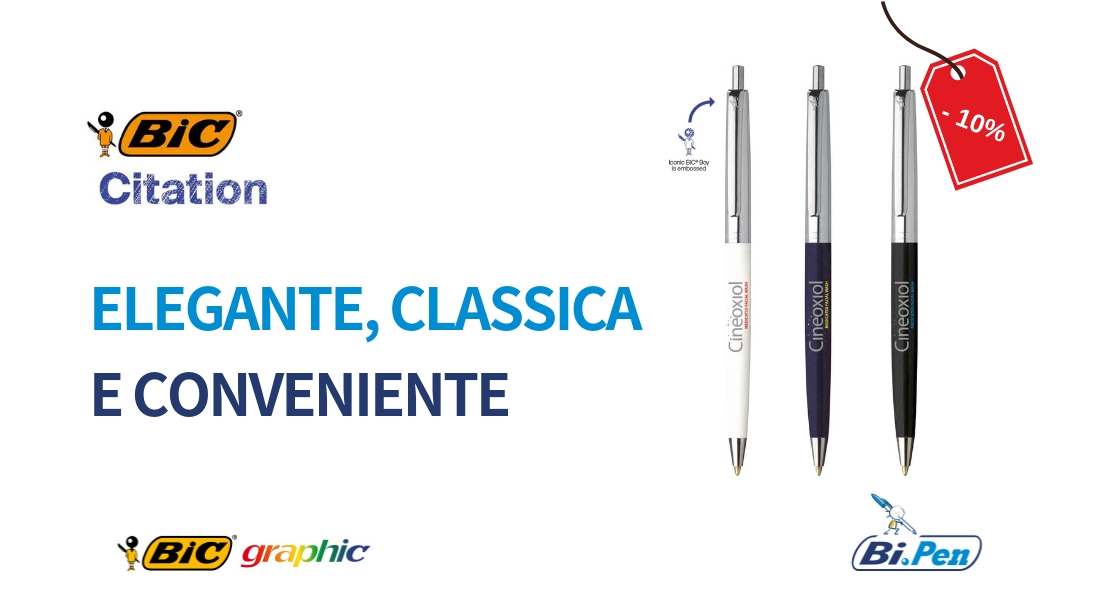 Bic Citation è la penna dal profilo sottile che puoi personalizzare con il tuo logo aziendale per massimizzare il tuo messaggio. Prova il configuratore automatico Bi.Pen, scopri le migliaia di combinazioni di colore disponibili e scopri come anche una penna istituzionale come Bic Citation diventa lo strumento promozionale perfetto. Se la acquisti poi in questi giorni, ancora per poco potrai usufruire dello sconto del 10%. Che aspetti? Nel 2019 distinguiti dalla massa, scegli la qualità Bi.Pen.