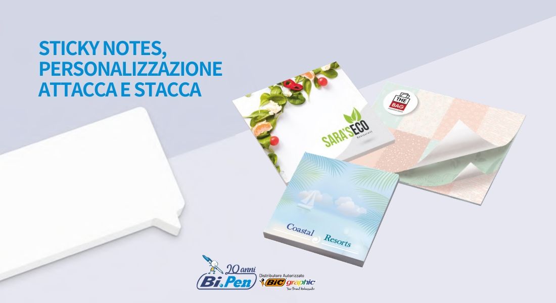 Indispensabili in qualsiasi ufficio Bic Sticky Notes sono strumenti di promozione pubblicitaria potenti che possono essere completamente personalizzati. Contatta Bi.Pen e potrai scegliere tra una vasta gamma di Sticky Notes di varie forme e dimensioni personalizzabili con logo e colori aziendali. Dei blocchetti adesivi Bic puoi scegliere la versione Ecolutions, prodotta con carta 100% riciclabile. Puoi scegliere anche il numero di foglietti che comporranno il tuo blocchetto adesivo personalizzato e così massimizzare la tua capacità di promuovere il messaggio. Inizia a personalizzare qui.