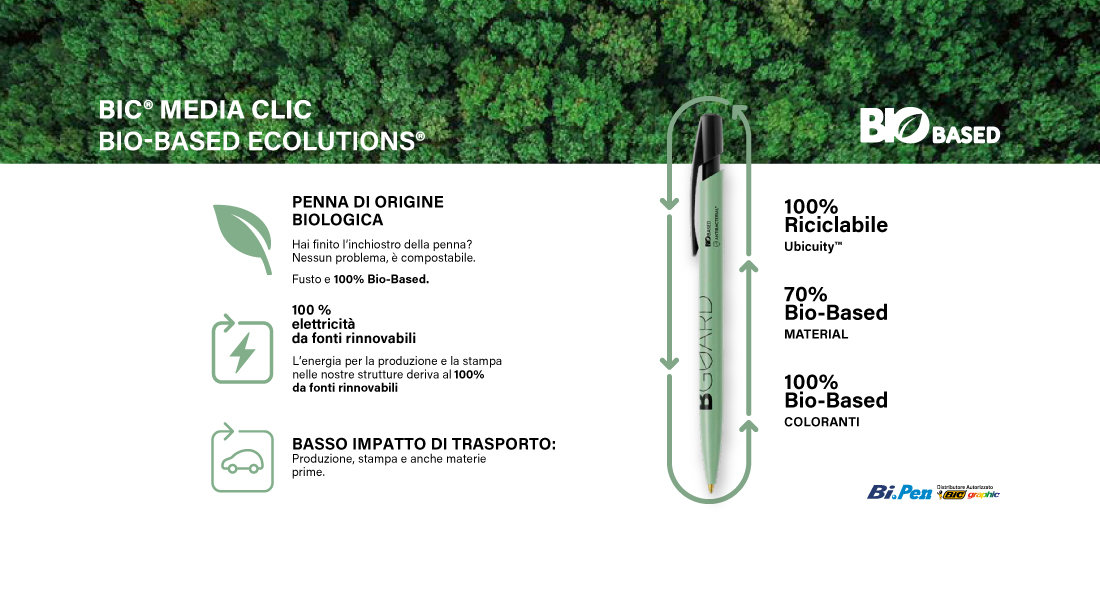 La sostenibilità è la sua priorità. Se cerchi la penna sostenibile per eccellenza e pure personalizzabile sei nel posto giusto: scegli Bic Media Clic Bio-Based Ecolutions, la penna di origine biologica. Questa penna è 100% riciclabile, prodotta al 70% da materiale base bio. Anche i coloranti sono al 100% bio. Infatti quando finisce l’inchiostro è completamente compostabile, biodegradabile in condizioni industriali.