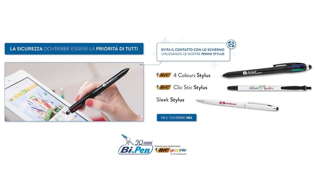 Vuoi evitare il contatto con lo schermo di uno smartphone, di un tablet o di uno sportello automatico? Puoi farlo con le penne Bic Stylus. Su Bi.Pen puoi personalizzare 4 Colours Stylus e Clic Stic Stylus con il tuo logo aziendale e pensare di fare un bellissimo regalo aziendale ai tuoi clienti. Un recente studio ha, infatti, rivelato che il virus che causa il covid-19 può sopravvivere fino a 28 giorni su superfici lisce come il vetro che si trova sugli schermi dei telefoni cellulari e dei tablet. Perciò non potendoli sempre igienizzare una penna Stylus, studiata per funzionare sia come penna biro che per cliccare sugli schermi è la soluzione ideale!