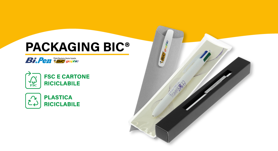 Scopri l’esclusivo packaging Bic nella versione Ecolutions per confezionare tutti i tuoi strumenti di scrittura Bic con una scelta sostenibile oltre che di qualità.