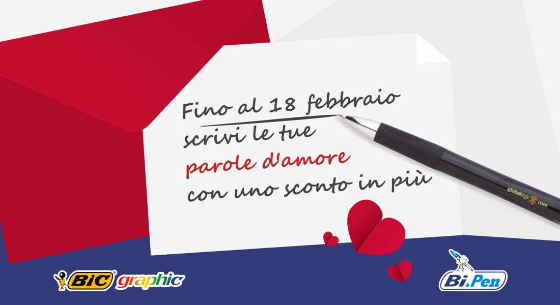 Solo se ti iscrivi alla newsletter puoi ottenere uno sconto speciale del 15% su tutti i prodotti personalizzati Bic e scrivere così le tue parole d’amore in maniera conveniente. La promozione è valida fino al 18 febbraio su tutti gli acquisti. Per usufruirne basta lasciare la mail sul nostro sito nella sezione “Iscriviti alla newsletter” in fondo alla home page. Trasformare i sistemi di scrittura affidabili del marchio Bic in uno strumento promozionale altamente affidabile da oggi è ancora più conveniente! Approfittane!