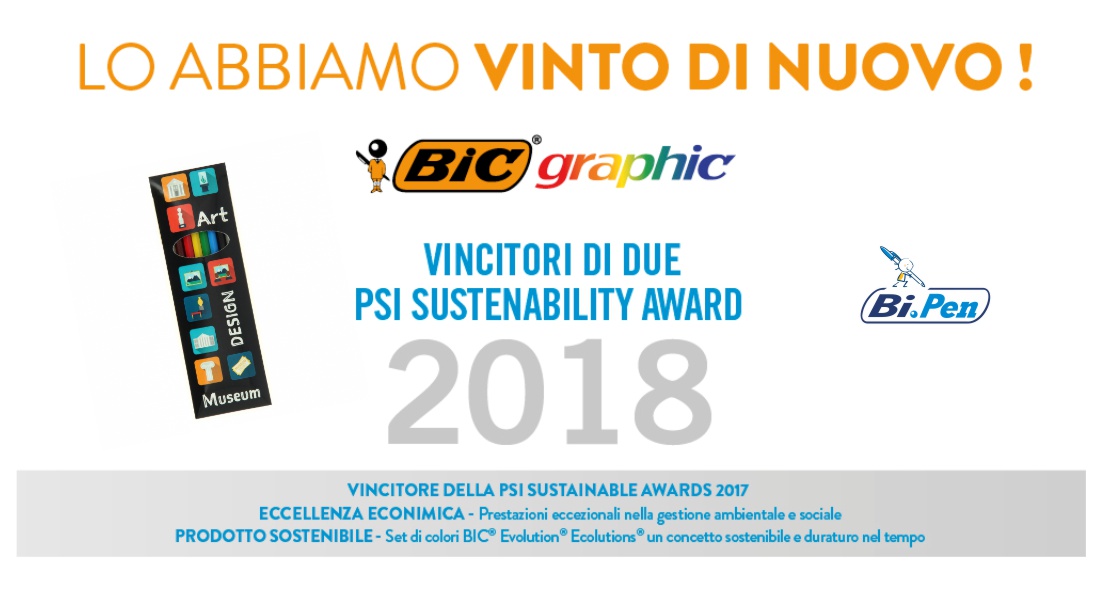 Pratichi la sostenibilità? Scegli il Prodotto Sostenibile dell’anno: il set di colori Bic Evolution Ecolutions, un concetto sostenibile e duraturo nel tempo. Si tratta del set di sei matite colorate super resistenti e facili da temperare, presentati in un astuccio di cartone completamente personalizzabile. Il prodotto è realizzato con il 50% di materiale riciclato. Con questo prodotto Bicgraphic ha trionfato ai PSI Sustenibilty Award 2018, il premio che riconosce l’impegno che le aziende del settore promozionale rivolgono alla sostenibilità, all’impatto ambientale e alla responsabilità sociale.