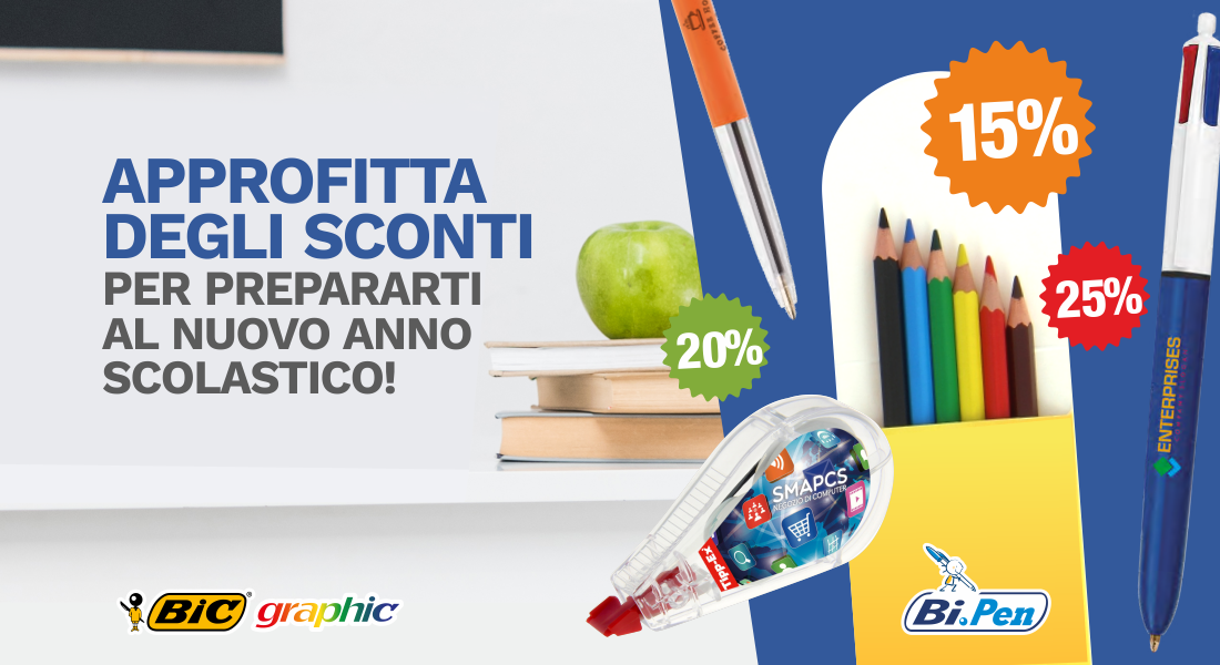 Il rientro a scuola sarà più bello e divertente con le penne, le matite, i colori, gli evidenziatori, gli sticky notes e l’ampia gamma di strumenti di scrittura personalizzabili in poche semplici mosse con il nostro configuratore online. Contattateci subito per ricevere il coupon promozionale! Potrete usufruire degli imperdibili sconti per prepararvi al nuovo anno scolastico con un set completo di prodotti Bic che scrivono perfettamente, rispettano l’ambiente e resistono anche alle prove più difficili!