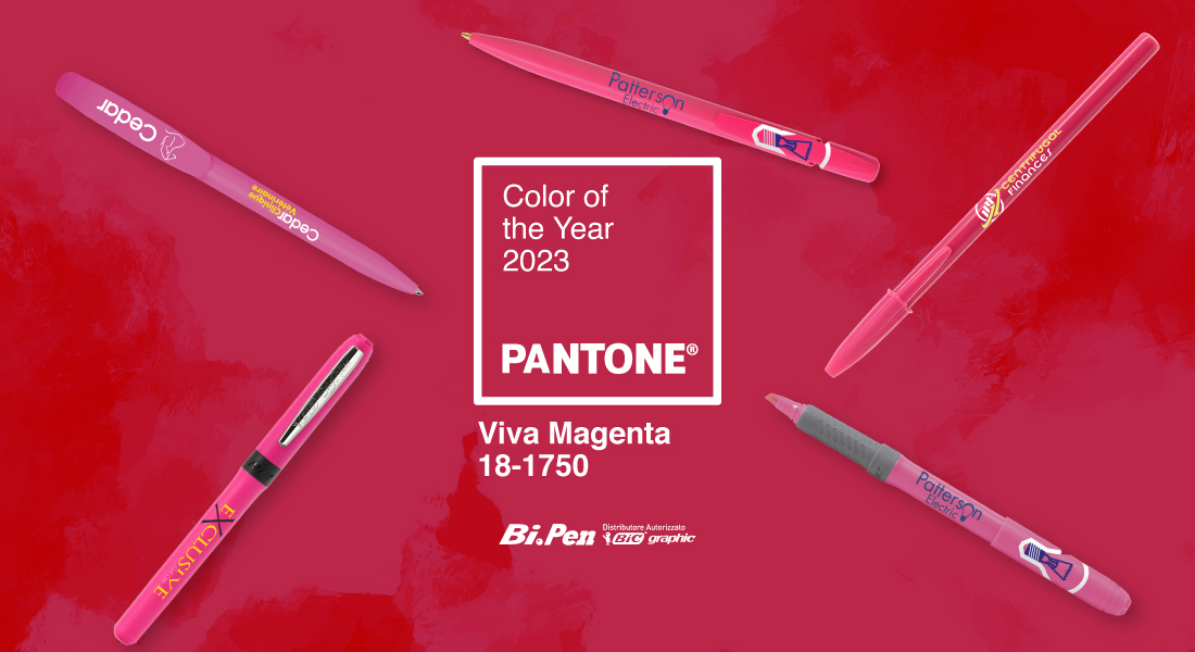 Qual è il colore del 2023? Per Pantone è il Viva Magenta: rosso cremisi o carminio che richiama uno spirito ottimista e incoraggia la sperimentazione tecnologica e virtuale. Una sfumatura di colore vibrante, gioiosa e ottimista che può essere ripresa per personalizzare i colori di una penna e così trasmettere questi valori anche quando si pubblicizza il proprio brand.